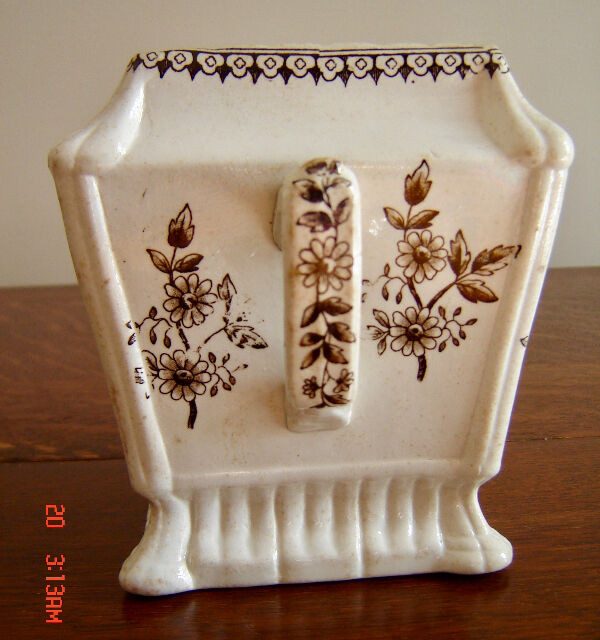 This is a lovely antique bowl made by Alfred Fenton & Co. Staffordshire, England in the late 1800’s. It is a brown transferware floral pattern called Elsmere done on white Ironstone. The bowl measures 5″ high by 7″ wide including handles. Alfred Fenton & Company were earthenware manufacturers at the “Brook Street Works”, Hanley Staffordshire from 1887-1901. The partners were Alfred Fenton, James Tunstall Fenton, Arthur Fenton and John Fenton. This is a beautiful example of transferware in a delicate soft floral pattern. The bowl would look lovely with flowers, soaps, cotton balls or a plant in any area of the home.