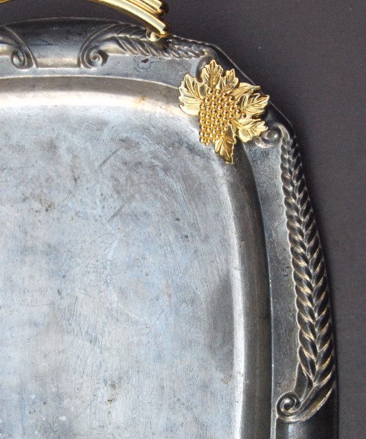 Available is a vintage serving tray. Brass handles with 4 grape bunch accents on probably coated tin or steel. Nice patina I didn’t risk trying to clean. Some minor surface oxidation on the bottom. Otherwise fine ornate detailing and quite solid. A fun piece not to be confused with your best sterling.