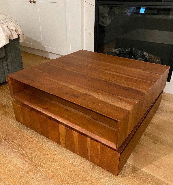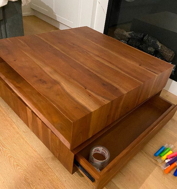 A beautiful coffee table originally purchased at CB2. Two drawers for storage and a swivel top. The table is in an excellent used condition. Pick up from college and Lansdowne.