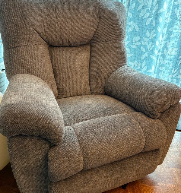 * Recliner (Swivel Rocker Recliner) – Soft and cozy, great for relaxing at home. Features three positions: fully reclined with leg rest, upright, and covered with a dust sheet (never used). (Purchased from Brick, originally $777.37) – $205