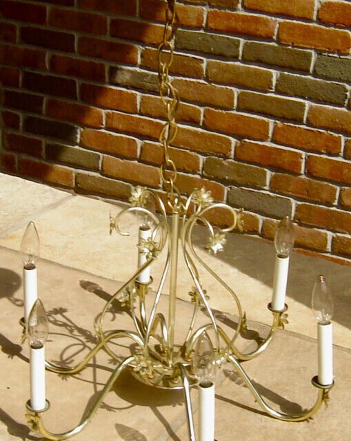 This is a lovely decorative six armed chandelier fixture. It has beautiful decorative flower rosettes scattered all over the fixture which give the fixture an airy delicate look. The chandelier measures 13″ high, with a diameter of 20″ and a drop including the chain of 26″ which can be adjusted. Perfect for any area of the home.