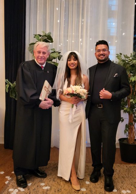 “We wanted to take a moment to express our deepest gratitude for the incredible job you did officiating our wedding. Your professionalism, warmth, and impeccable manners truly made the moment unforgettable. From the moment we met you, we knew we were in good hands. Your attention to detail and your ability to keep the conversation going. Your calming presence helped us navigate through the nerves and emotions of the day with ease. Your genuine care and passion for what you do truly shone through, and we couldn’t have asked for a better officiant to unite us in marriage. Thank you once again for your outstanding service. We will forever remember that you played a significant role in making it happen. With heartfelt thanks.” -Rami & InesI offer one of the most professional, cost efficient and simplest solutions for couples looking to have their Marriage License signed and registered – Hold your simple/intimate ceremony/marriage license signing at my location (Dufferin & Bloor) for $100.00 – one of the most reasonable fees for this service in the GTA.