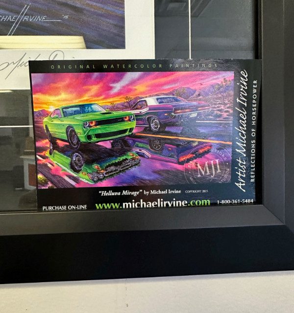 Limited Edition framed print “Helluva Mirage” — Classic & Modern Challengers by Michael Irvine. Image is of a 2015 SRT Hellcat and it’s classic predecessor, the 1971 Challenger RT 440 Six Pack and then as mirror images below.Size 32″ x 21″ – number 83/800. (Image size 28″ x 16″) 10pt satin finish, acid free, museum quality stock. Excellent condition.