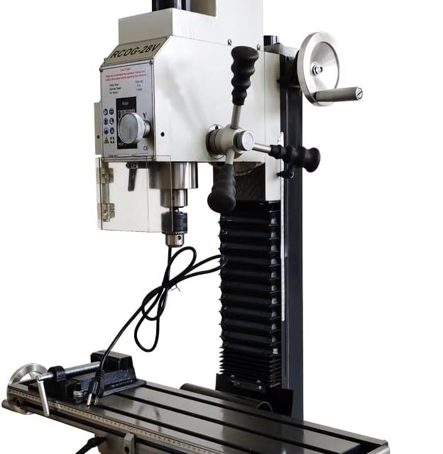 Item number: 028356-Product OverviewRCOG-28V multi-functional drilling and milling machine has rich functions, can meet the metal, wood, plastic, Buddha beads and other finishing, all copper brushless motor, strong power, simple operation, durable, high processing accuracy, is the home DIY processing of various parts of the necessary machine.Product ParametersModel: RCOG-28VVoltage: AC110V/60HzMotor power: 1300W brushless motorX axis stroke: 18.9”(480mm)Y axis stroke: 6.9”(175mm)Z axis stroke: 11”(280mm)Spindle incline Angle: 90(The nose can actually rotate 360 degrees)Max. drilling diameter: 1.1”(28mm)Max. Face screening capacity: 2.5”(63mm)Max. vertical milling capacity: 0.79”(20mm)Distance from spindle to table: 13.8”(350mm)Spindle taper: R8Spindle stroke: 2”(52mm)The Range of spindle speeds: 20-2250rpmTable size: 27.5”*7.1”(700mm*180mm)T groove width: 0.47”(12mm)Package size: 35.4”*22.4”*37.8”(90cm*57cm*96cm)Net weight/Gross weight: 260.1LB(118kg)/313.0LB(142kg)Item Included(028356)Drilling and milling machine *1 Milling chuck set *1 Drill chuck *1Drill chuck retaining pin *1 Bench clamp *1 Fork wrench *2Drill chuck wrench *1 Oil can *1 Cross screwdriver *1Straight screwdriver *1 Hexagon wrench *4 English manual *1Notice1.Limited stock, please purchase ASAP if you want it.2.Before pickup, please call us to make sure.3.The price will be adjusted when there’s large fluctuations in exchange rates and raw material costs.4.Advertising price does not include the tax.Warehouse Address:2220 Midland Ave., Unit 60AP (Administration Park)Scarborough, ON M1P3E6Business Hours:Monday – Friday 9:00am – 4:30pmSaturday & Sunday Closed* For PICK UP, appointment by phone needed.Tel: 647-350-2889 416-727-3877http://asc365.com/newproductdetail.asp?productid=028356&typeid=2104