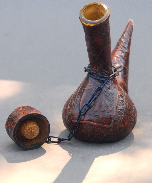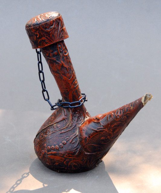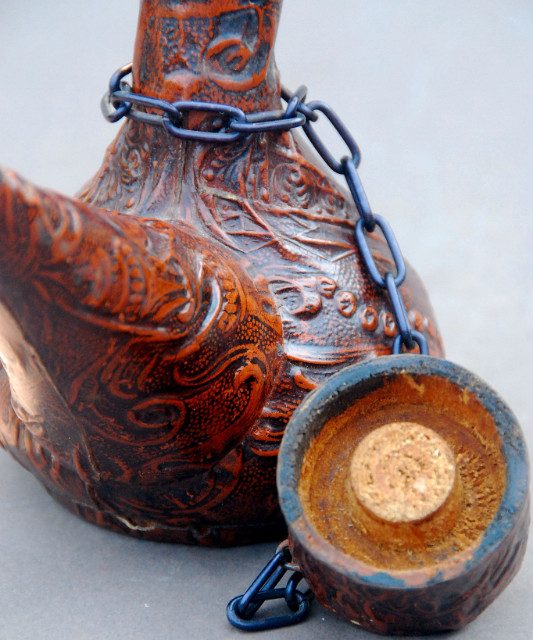 Available is a small leather bound glass decanter from Spain, approx. 8.5″ tall. Nice detailing in the leather; back panel of the bottle depicts a couple of Flamenco dancers. Protective chain fitted tightly at top so as to prevent accidental loss. Some leather wear right at the tip of the spout. Clean.