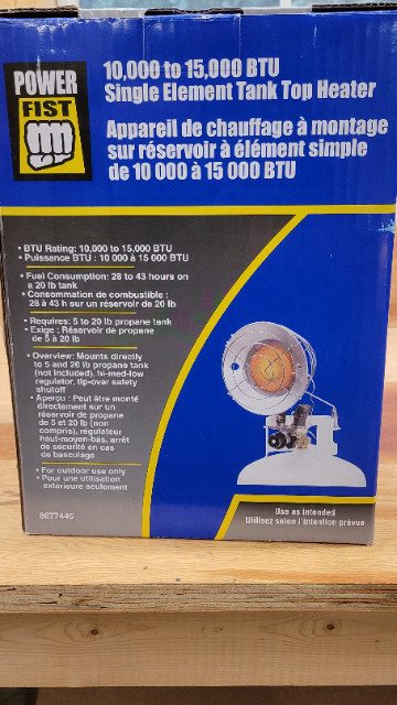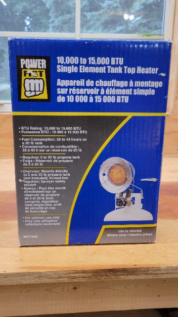 Tank top heater for the duck/deer blind to the garage. This handy heater can be used anywhere you need a boost of warmth to enjoy yourself or to just get the job done. It runs on propane from a bulk 20lb tank. Heats to 15000 BTU. Brand new unopened box. Won at a golf tournament