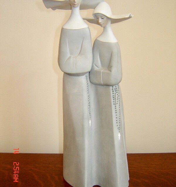 This lovely original Lladro figurine of two nuns was created in Spain in the 1970’s. The figurine is of two nuns standing close together with their Habit and Cornette on, rosaries hang at their sides. They are wearing lovely long pleated Habits and have their hands folded. The finish on this piece was done in the 1970’s and is of the “Bisque” or “Matte” porcelain finish as opposed to the more common high gloss of Lladro pieces. The back stamp to the base was used between 1971 and 1974. This is an early version of the sculpture. The colouring is soft grey, tan and white. The piece measures 13″ high and 5″ wide. The sculptor was Fulgencio Garcia and the Spanish name for the figurine is “Monjas”. This is a radiant Lladro piece created in Spain with intricate detail and incredible soft colours. Lladro figures are collected all over the world and are very sought after. This figurine is a must piece for your collection or a really special gift. This figurine will be a focal point in any area of the home.