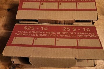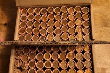 Two bankers boxes of pennies